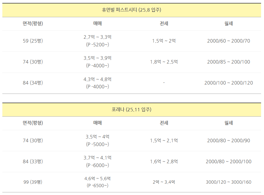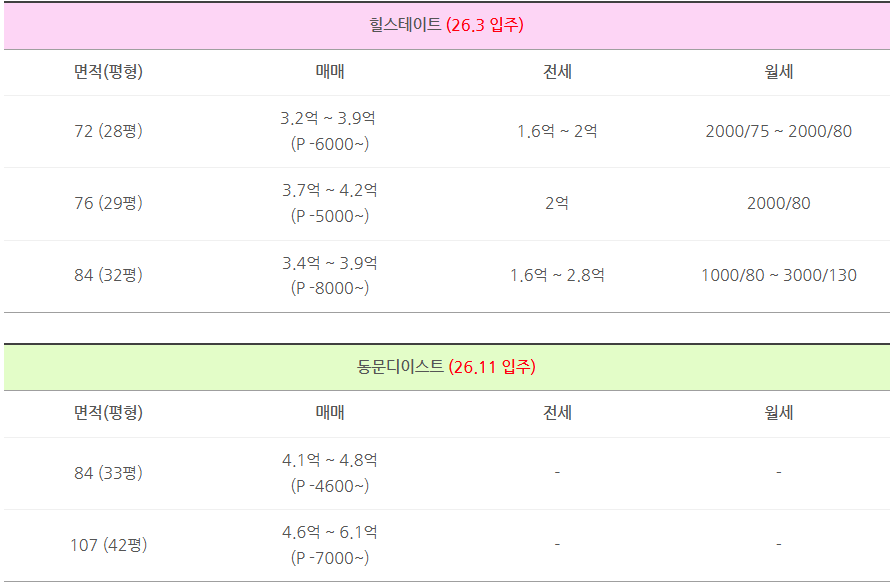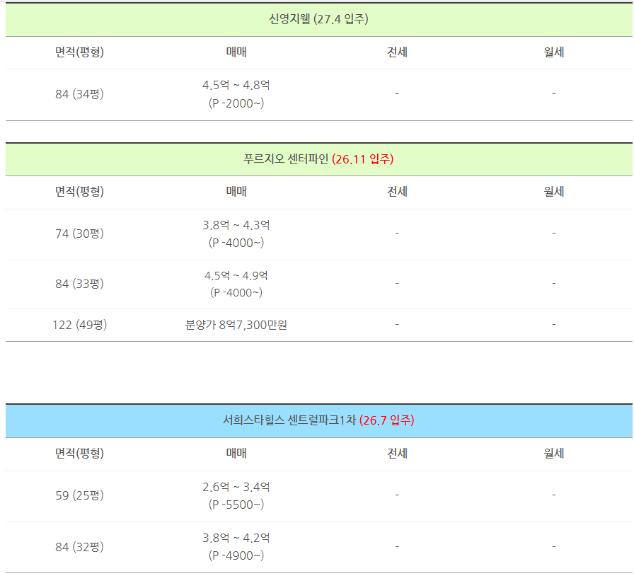 아래 각 단지별 입주시점,평형대 각각의 실거래금액,전세나 월세 가격을 적어드립니다